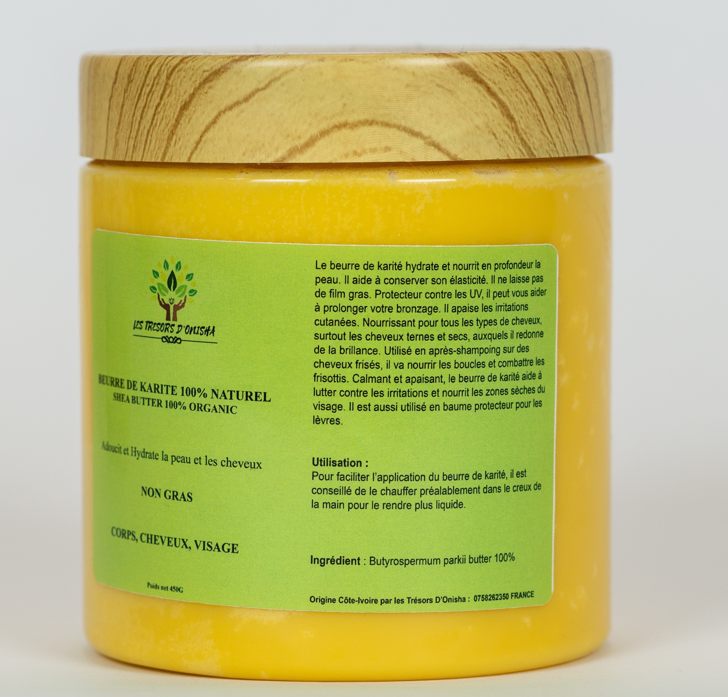 Le beurre de karité hydrate et nourrit en profondeur la peau, Il aide également à conserver son élasticité. Protecteur contre les UV, il peut vous aider à prolonger votre bronzage. Il apaise les irritations cutanées. Il est riche en vitamines A,E,D,F.